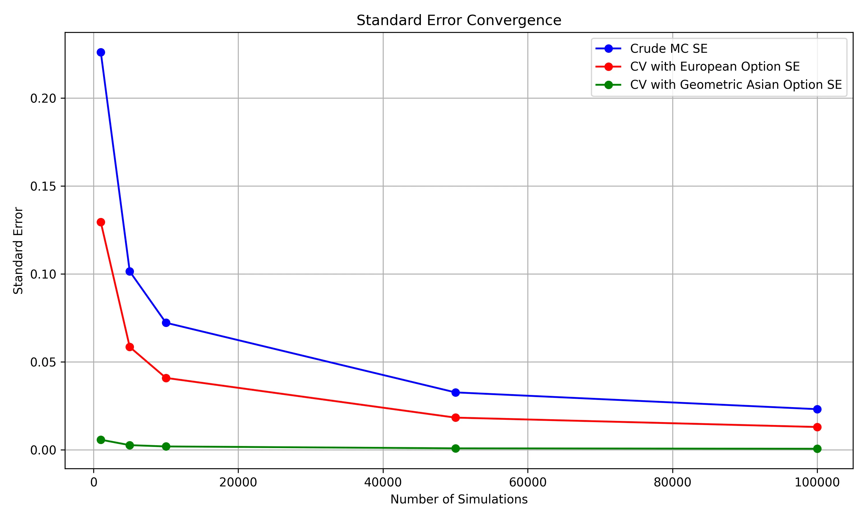 - The CV-Geo method demonstrates the most rapid decrease in standard error, showcasing its efficiency in variance reduction. This makes sense, as the correlation between the geometric option and the arithmetic one is the highest